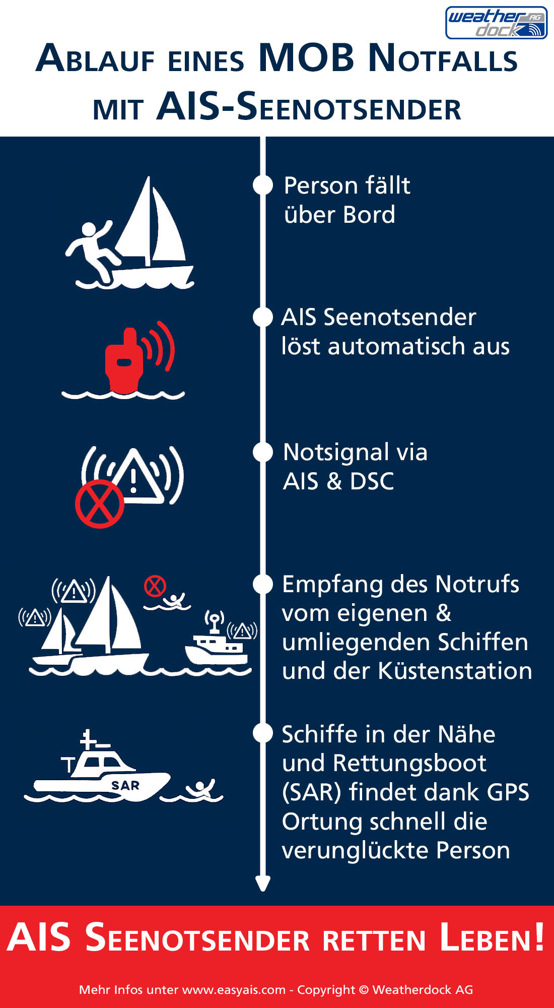 Ein AIS-Rettungssender (AIS MOB oder AIS SART) ist ein kompaktes, tragbares Gerät, das im Notfall automatisch oder manuell aktiviert wird. Nach der Aktivierung sendet es regelmäßig die GPS-Position der betroffenen Person über das automatische Identifikationssystem (AIS) an umliegende Schiffe und Küstenstationen. Dies ermöglicht eine schnelle Lokalisierung und Rettung – auch bei schlechten Sichtverhältnissen oder nachts.